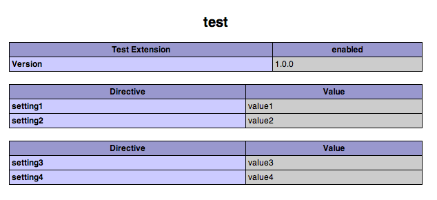 Like most extensions, Zephir extensions are able to show information in the phpinfo() output. This information is usually related to directives, environment data, etc.